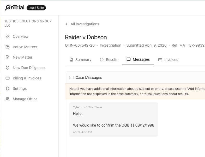 OnTrial is your dedicated investigations team — always on, always working.